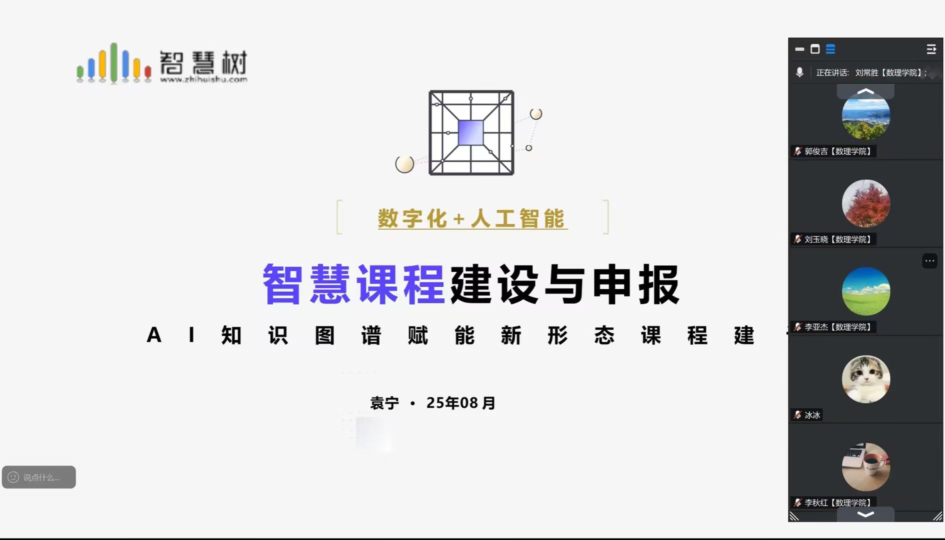 (通讯员 常洪利)为响应河南省教育厅关于2025年度本科高校精品课程建设及新兴交叉急需特需本科专业培育的相关要求,提升学院教师在智慧课程建设方面的能力。8月16日上午8:30,数理学院通过腾讯会议平台组织开展“AI知识图谱赋能新形态课程建设"专题培训。本次培训由徐华锋院长主持,特邀智慧树资深金课咨询师袁宁老师担任主讲,学院全体教师积极参与。
